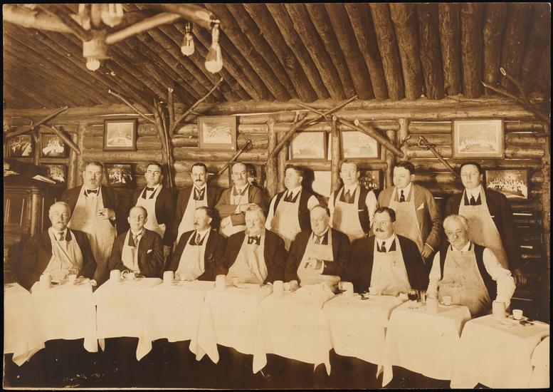 [Dining room, four men posing.]