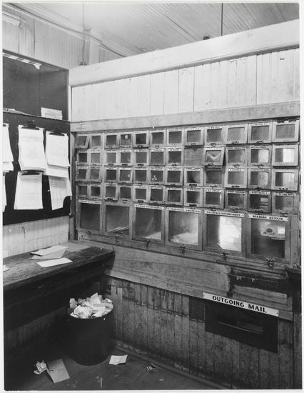 The Weehawken Ferry Story [Detail of mail chute in a mailroom with cards tacked above it.]