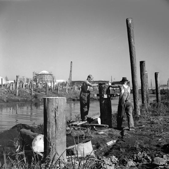 New York Worlds Fair. Aquacade, detail of pilings. Construction view