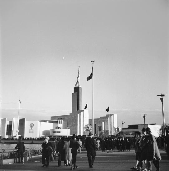 [New York World's Fair grounds, with the Trylon and Perisphere in the background.]
