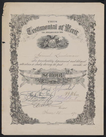 [Testimonial to punctuality, deportment and diligent attention to study.]