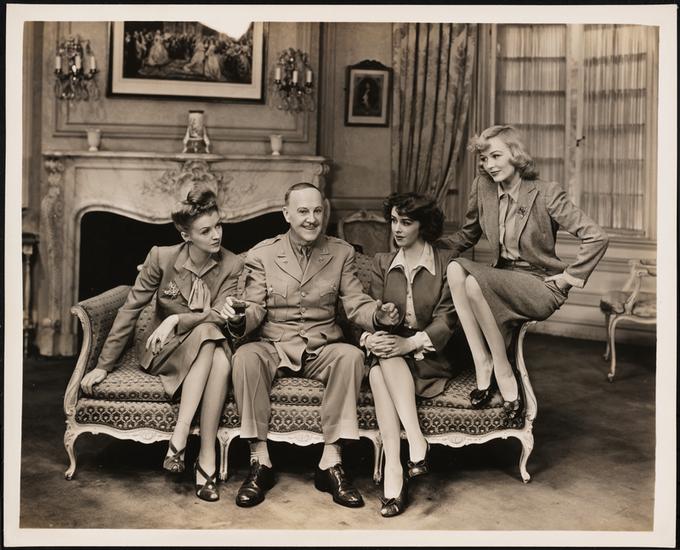 [Doris Nolan as Nan, Virginia Field as Edna, Arleen Whelan as Vivian and William J. Kelly as Brigadier General Slade in "The Doughgirls".]