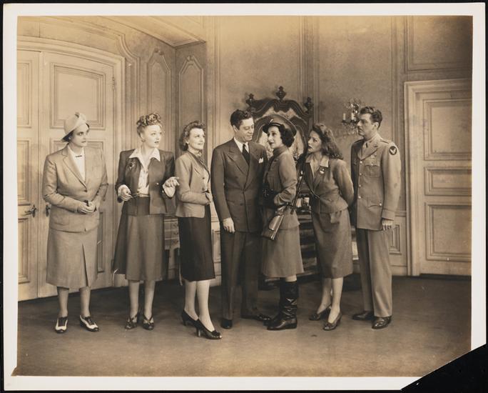 [Virginia Field as Edna, Doris Nolan as Nan, Arleen Whelan as Vivian and Thomas F. Tracey as Admiral Owens in "The Doughgirls".]