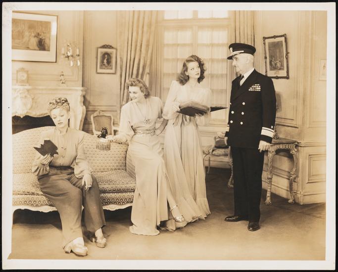 [Doris Nolan as Nan, Virginia Field as Edna, Arleen Whelan as Vivian and William J. Kelly as Brigadier General Slade in "The Doughgirls".]