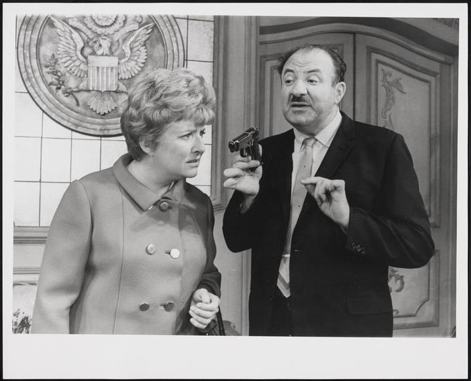 [Lou Jacobi and Peggy Cass at the stage door of "Don't Drink the Water".]