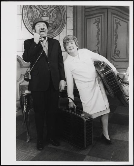 [Lou Jacobi and Peggy Cass at the stage door of "Don't Drink the Water".]