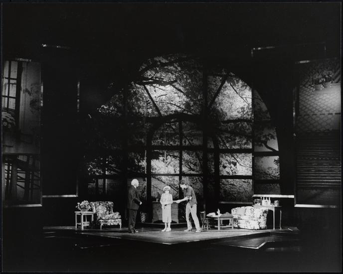 [Larry Pine as a member of the ensemble, Barnard Hughes as Philip Stone and John Shea as Michael Trent in "End of the World".]