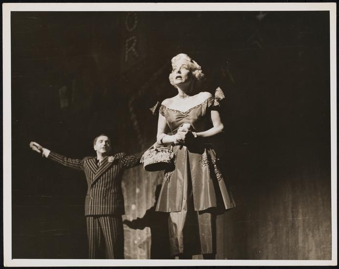 [Vivian Blaine as Miss Adelaide and Sam Levene as Nathan Detroit in "Guys and Dolls".]