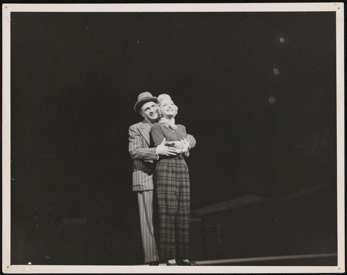 [Sam Levene as Nathan Detroit and Vivian Blaine as Miss Adelaide in "Guys and Dolls".]