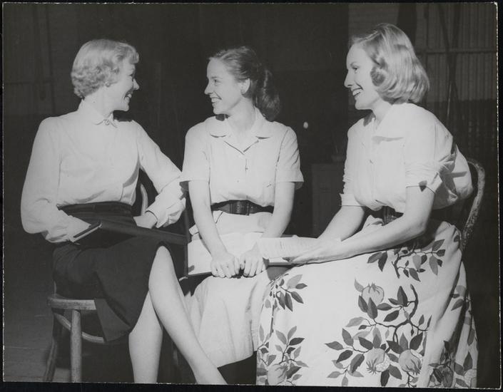 [Haila Stoddard, Melvyn Douglas, and Signe Hasso rehearsing for "Glad Tidings".]