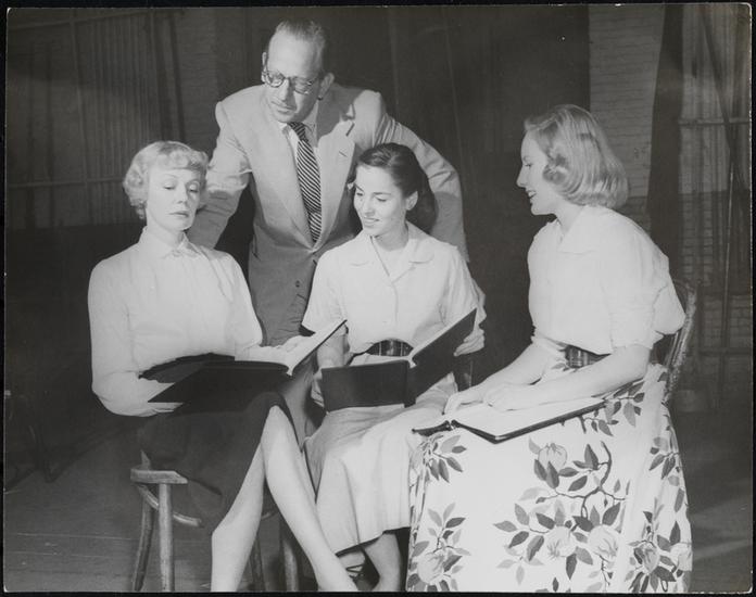 [Haila Stoddard, Melvyn Douglas, and Signe Hasso rehearsing for "Glad Tidings".]