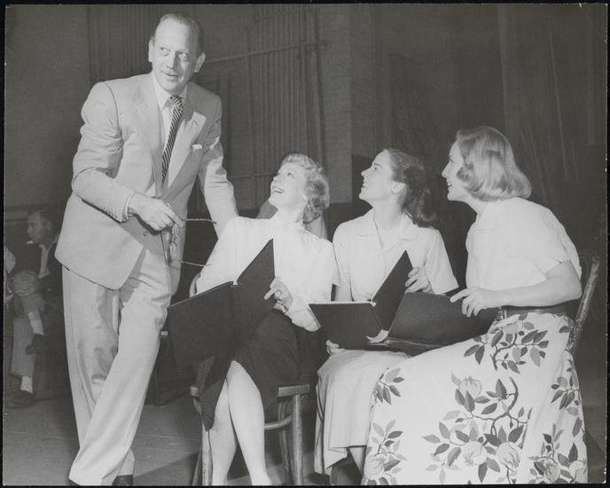 [Haila Stoddard, Melvyn Douglas, and Signe Hasso rehearsing for "Glad Tidings".]