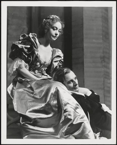 [Judith Anderson as Gertrude and John Gielgud in the title role of "Hamlet".]
