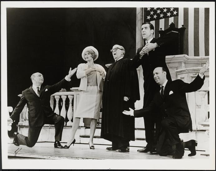 [Janis Paige as Doris Walker and Cliff Hall as Judge Martin Group in "Here's Love".]