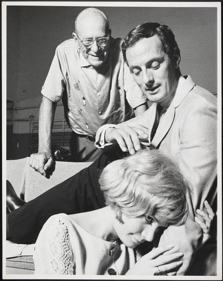 [Director George Abbott with Roddy Maude-Roxby and Valerie French during rehearsal for "Help Stamp Out Marriage!".]