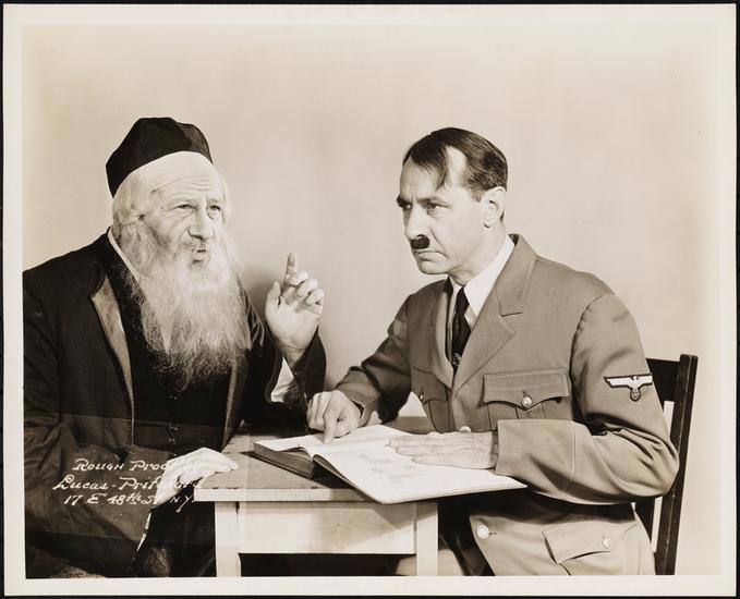 [Arthur Winton as General Von Bruck, Harry Green as Avrum Dovid and Brandon Peters as Adolf Hitler in "The Day Will Come".]