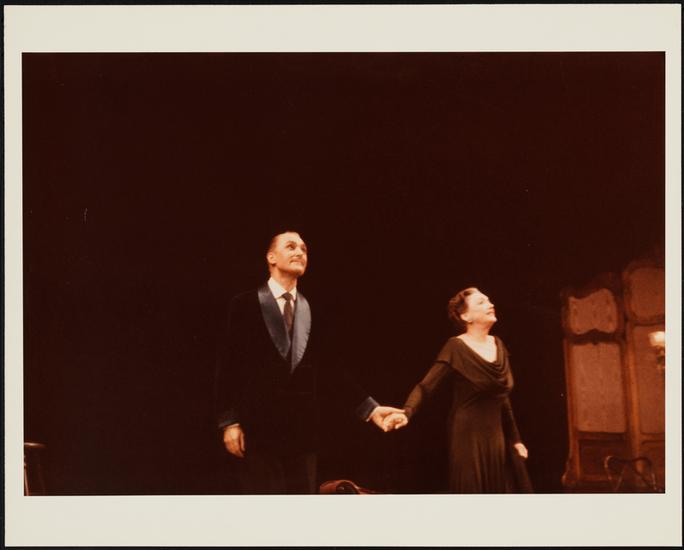 [Brian Aherne as George Bernard Shaw and Katharine Cornell as Mrs. Patrick Campbell during a curtain call for "Dear Liar".]