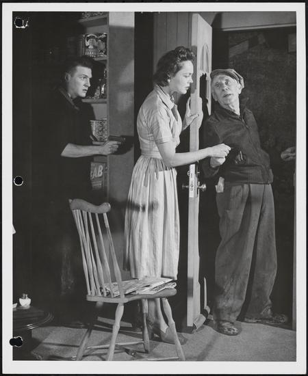 [George Grizzard as Hank Griffin, Nancy Coleman as Eleanor Hillard and Wyrley Birch as Mr. Patterson in "The Desperate Hours".]