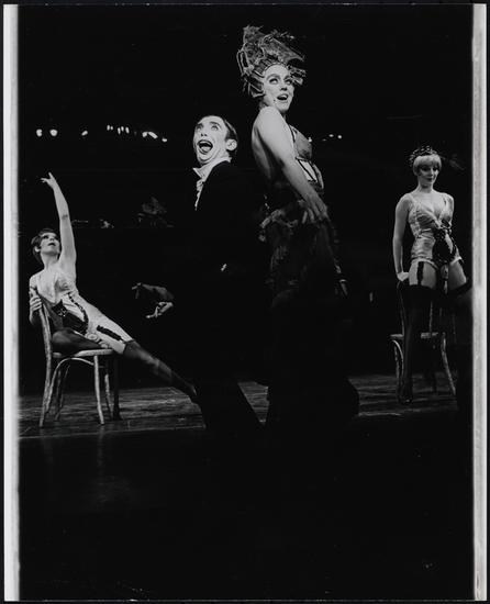 [Martin Ross as Master of Ceremonies with the Kit Kat Girls in "Cabaret".]