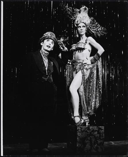 [One of the Kit Kat Girls with Joel Grey as Master of Ceremonies in "Cabaret".]