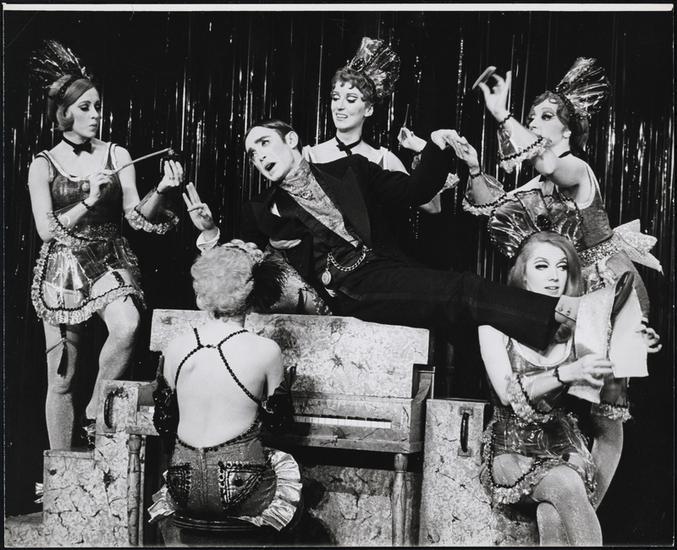 [Joel Grey as Master of Ceremonies with Kit Kat Girls performing the number "The Money Song" in "Cabaret".]