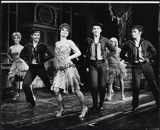 [Anita Gillette as Sally Bowles with the Kit Kat Girls in "Cabaret".]