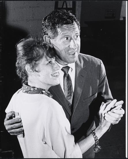 [Lotte Lenya as Fraulein Schneider and Jack Gilford as Herr Schultz performing the number "It Couldn't Please Me More" in "Cabaret".]