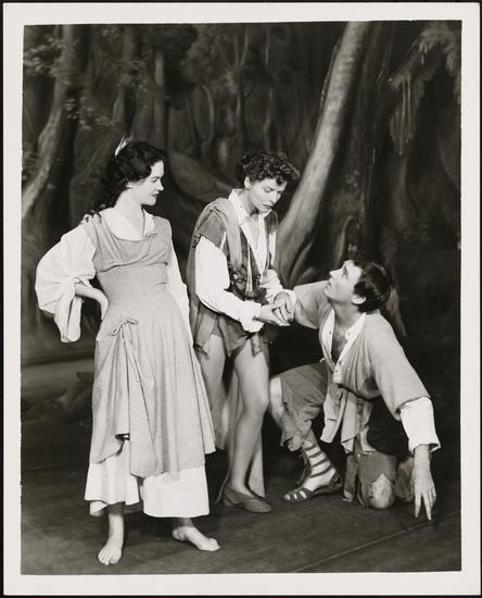[John Burgess as Orlando, Margretta Ramsey as Rosalind and Nancy [Hoadley?] as Phoebe in "As You Like It".]