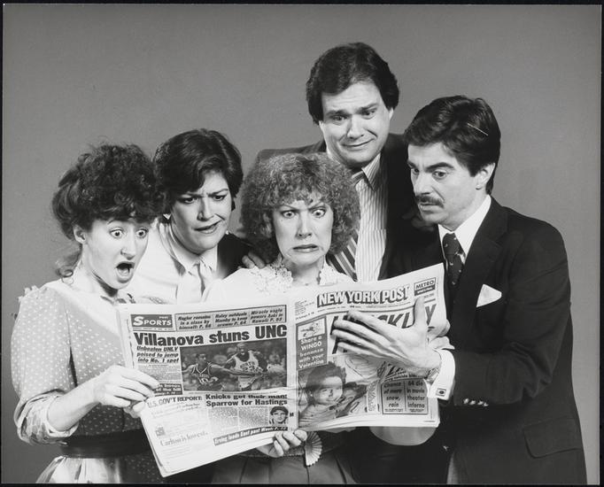 [Vicki Lewis, Gary Beach, Carolyn Casanave, Ray Gill, and Karen Mason in "A Bundle of Nerves".]