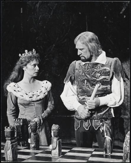 [Richard Harris as Arthur and Meg Bussert as Guenevere in "Camelot".]