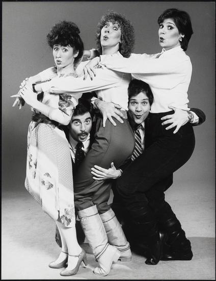 [Vicki Lewis, Karen Mason, Carolyn Casanave, Ray Gill, and Gary Beach in "A Bundle of Nerves".]