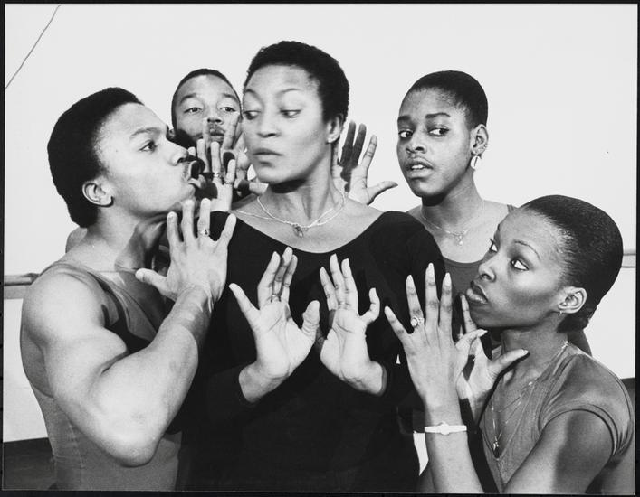 [Adrian Bailey, Charles Wynn, Ralph Farrington, Talley Beatty, and Paula Kelly rehearsing for "Alice".]