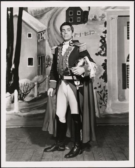 [Nanette Fabray as Jo Kirkland, John Conte as Col. Mortimer Sherwood, and Georges Guétary as Franz in "Arms and the Girl".]