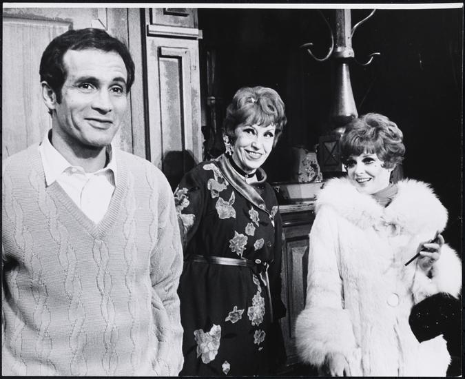 [Alfred Toigo as Clifford Bradshaw, Susan Willis as Fraulein Schneider, and Anita Gillette as Sally Bowles in "Cabaret".]