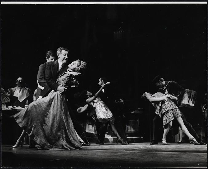 [Lotte Lenya as Fraulein Schneider and Jack Gilford as Herr Schultz performing the number "It Couldn't Please Me More" in "Cabaret".]