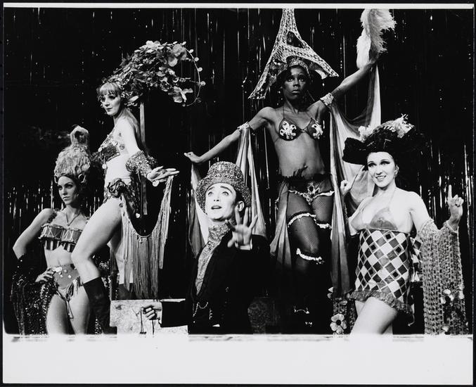 [Joel Grey as Master of Ceremonies with the Kit Kat Girls in "Cabaret".]