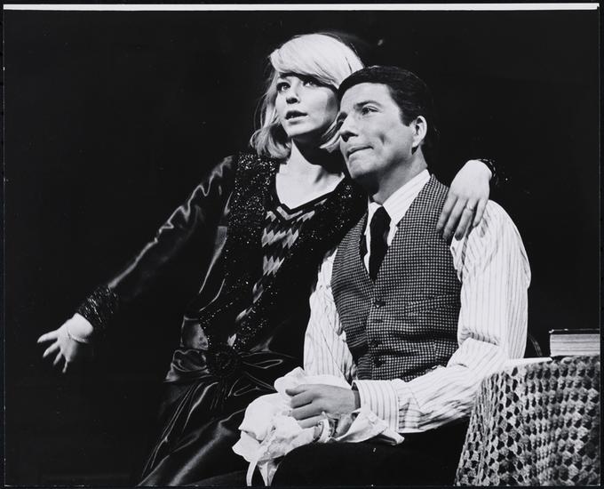 [Jill Haworth as Sally Bowles and Ken Kercheval as Clifford Bradshaw in "Cabaret".]