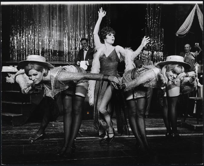 [Anita Gillette as Sally Bowles with the Kit Kat Girls in "Cabaret".]