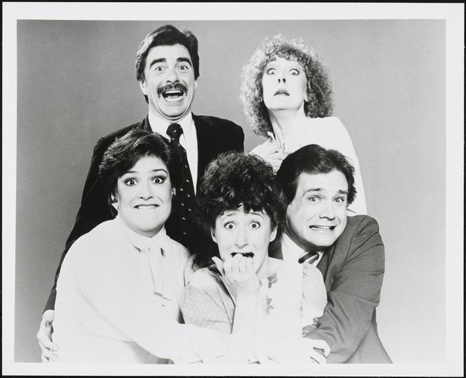 [Vicki Lewis, Gary Beach, Carolyn Casanave, Ray Gill, and Karen Mason in "A Bundle of Nerves".]