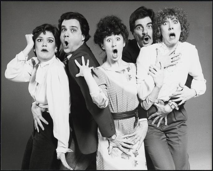 [Vicki Lewis, Gary Beach, Carolyn Casanave, Ray Gill, and Karen Mason in "A Bundle of Nerves".]