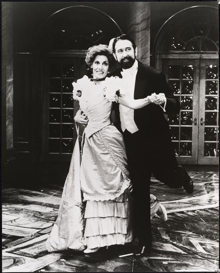 [Raul Julia as Leo, Ann Swift as Gilda and Frank Converse as Otto in "Design for Living".]