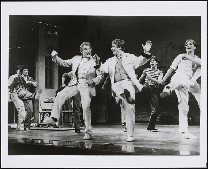 [Gene Barry as Georges and George Hearn as Albin in "La Cage aux Folles".]