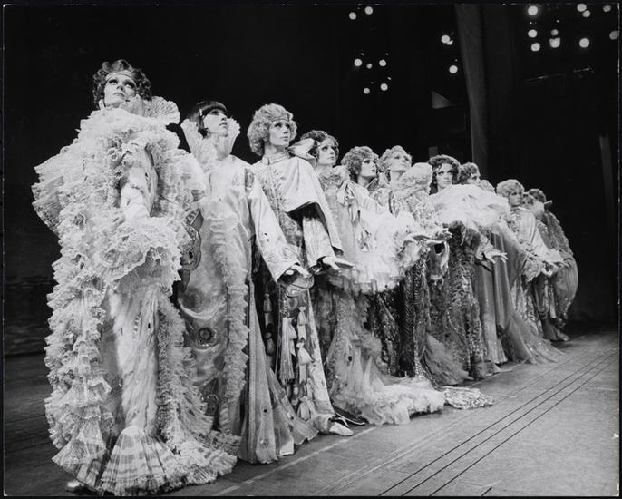 [George Hearn as Albin with Les Cagelles in "La Cage aux Folles".]
