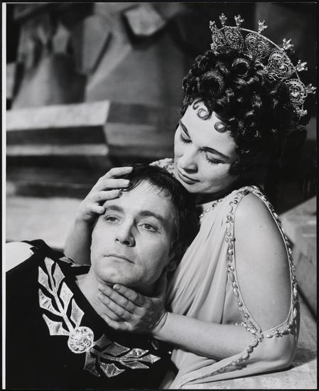 [Colleen Dewhurst as Caesonia and Philip Bourneuf as Cherae in "Caligula".]