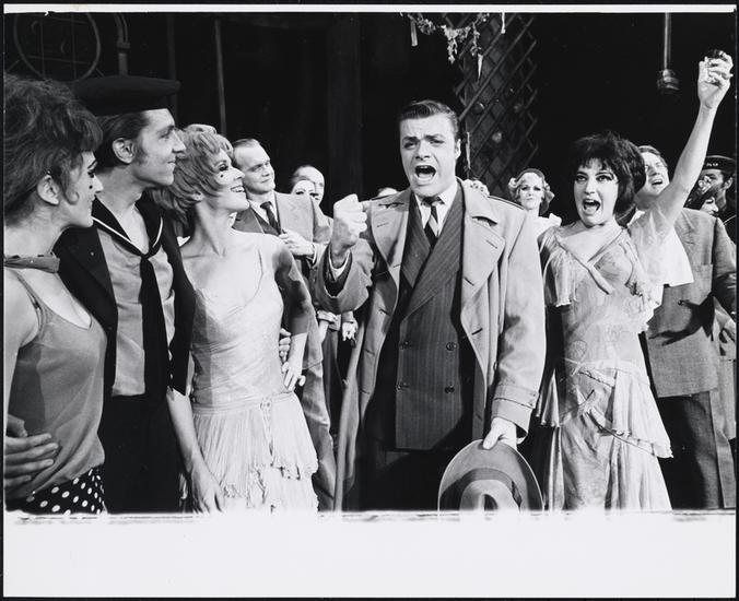 [Alfred Toigo as Clifford Bradshaw, George Reinholt as Ernst Ludwig, and Anita Gillette as Sally Bowles in "Cabaret".]