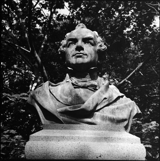 ["Albert Bertel Thorvaldsen" self portrait bronze figure on granite pedestal.]