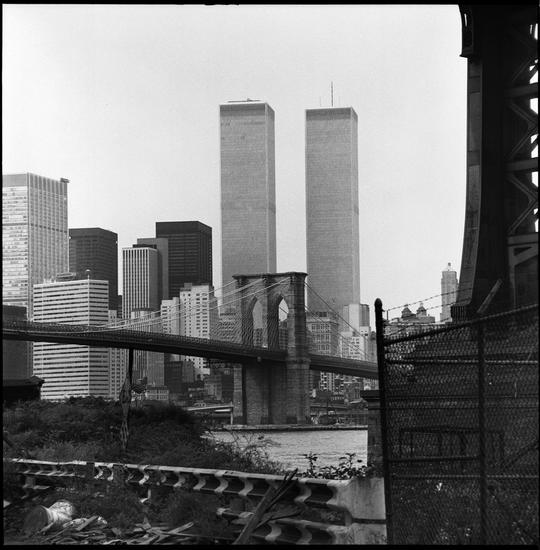 [Looking toward the twin towers of the World Trade Center from Vinegar Hill.]