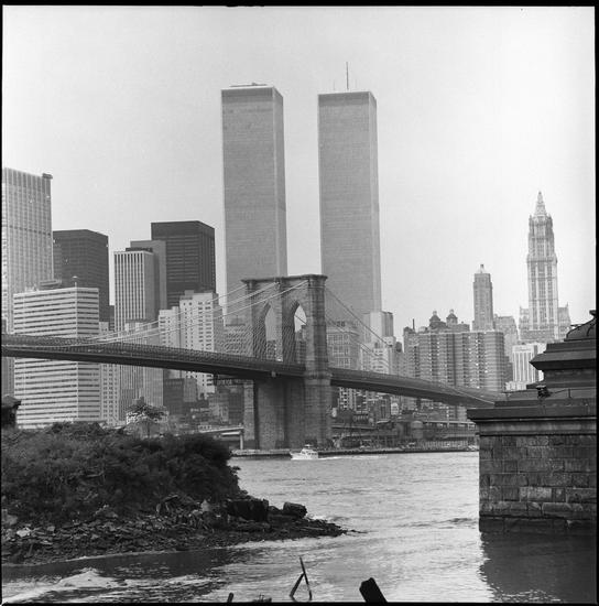 [Looking southwest across the East River to the twin towers of the World Trade Center from Brooklyn.]