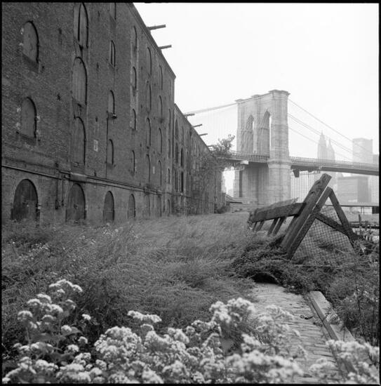 [Looking west on Old Fulton Street across the East River to Lower Manhattan.]