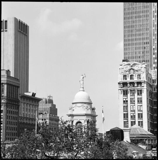 ["Justice" statue on cupola of City Hall, with "Civic Fame" statue on tower of Municipal Building in background.]